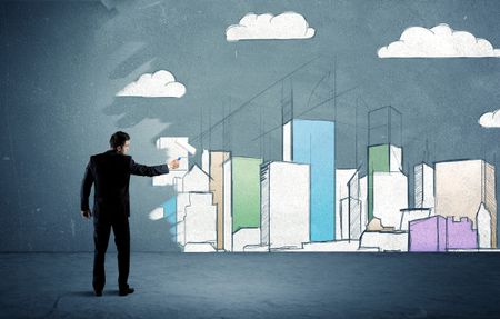 An elegant businessman standing with a paint roller transforming a blue wall into urban city landscape drawing sketch including skyscrapers and clouds concept