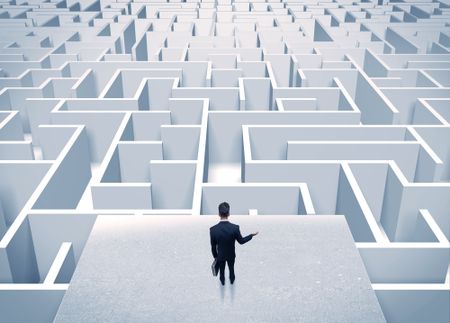 An elegant businessman standing on a square platform looking over infinite labyrinth concept