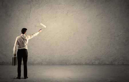 An elegant businessman in suit holding a paint roller, standing with his back, facing an empty urban concrete wall concept