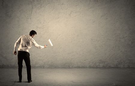 An elegant businessman in suit holding a paint roller, standing with his back, facing an empty urban concrete wall concept