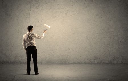 An elegant businessman in suit holding a paint roller, standing with his back, facing an empty urban concrete wall concept