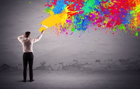 An elegant businessman in suit painting colorful splatter, bright colors on grey urban wall with a paint roller in his hand concept
