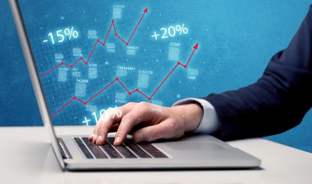 An elegant businessman working on graph statistics calculation using a laptop with clear blue background concept