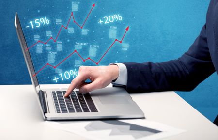An elegant businessman working on graph statistics calculation using a laptop with clear blue background concept