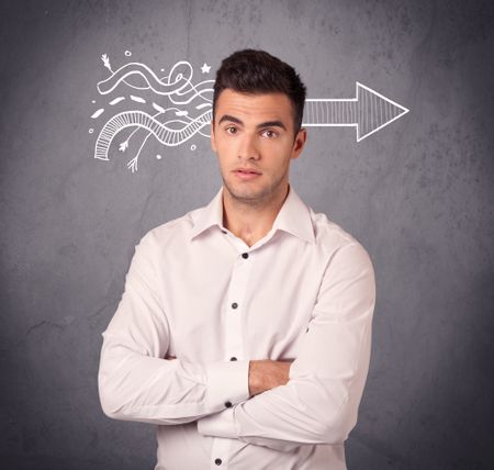 An elegant confident businessman in suit knows the solution to a problem concept with drawn arrow illustration on urban concrete wall concept