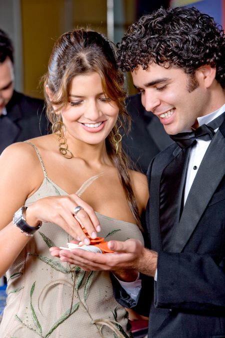elegant couple at the casino smiling and betting on the roulette