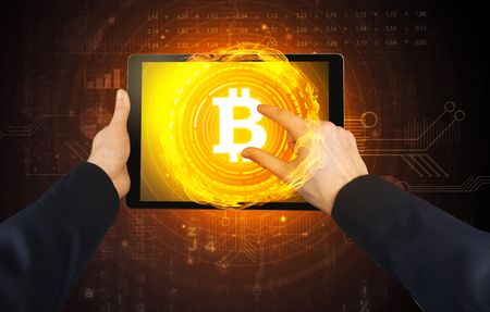 Elegant hand touching tablet with cryptocurrency concept