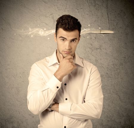 An elegant handsome business guy standing in front of wall with a bullet going through his head, making facial expressions concept