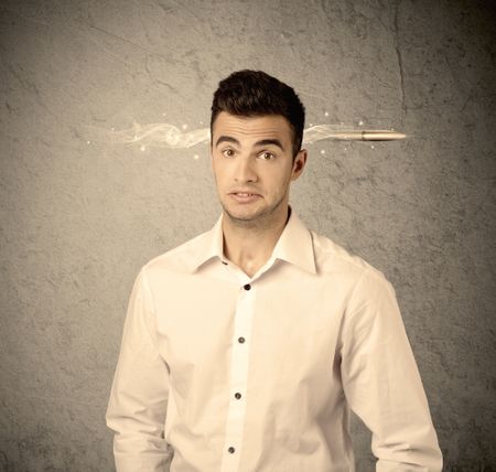 An elegant handsome business guy standing in front of wall with a bullet going through his head, making facial expressions concept