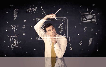 An elegant happy businessman drawing a television around his face, dreaming about becoming a famous actor or a programme presenter concept
