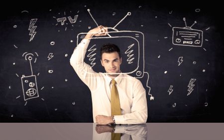 An elegant happy businessman drawing a television around his face, dreaming about becoming a famous actor or a programme presenter concept