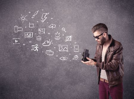 An elegant hipster guy trying to use a vintage camera with camera settings icons drawn on wall, like flash, white balace or ISO value concept