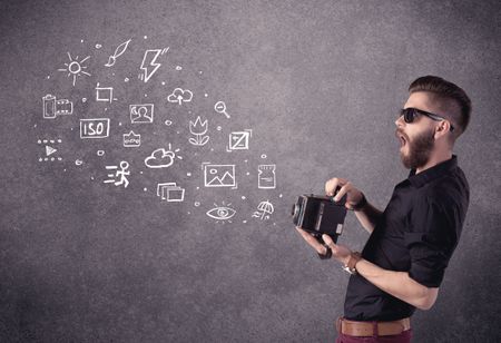 An elegant hipster guy trying to use a vintage camera with camera settings icons drawn on wall, like flash, white balace or ISO value concept