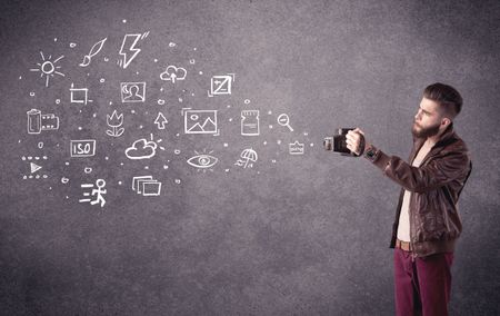 An elegant hipster guy trying to use a vintage camera with camera settings icons drawn on wall, like flash, white balace or ISO value concept