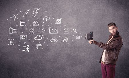An elegant hipster guy trying to use a vintage camera with camera settings icons drawn on wall, like flash, white balace or ISO value concept