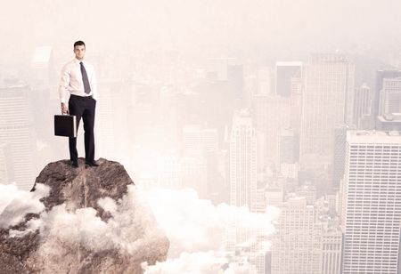An elegant professional business male standing on top of a high cliff above the clouds looking at the city concept