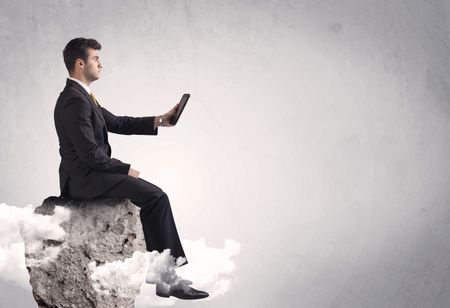An elegant smart businessman with laptop sitting in empty grey space on top of a cliff, between clouds concept