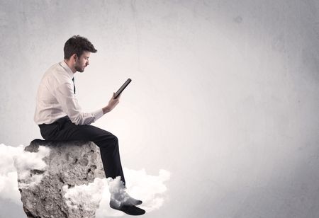 An elegant smart businessman with laptop sitting in empty grey space on top of a cliff, between clouds concept