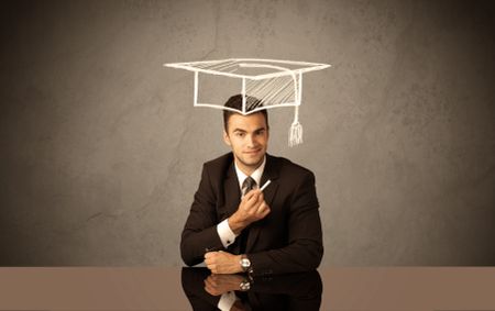 An elegant, successful university student drawing himself a square academic mortarboard cap with a chalk in front of grey wall background concept