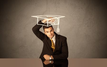 An elegant, successful university student drawing himself a square academic mortarboard cap with a chalk in front of grey wall background concept