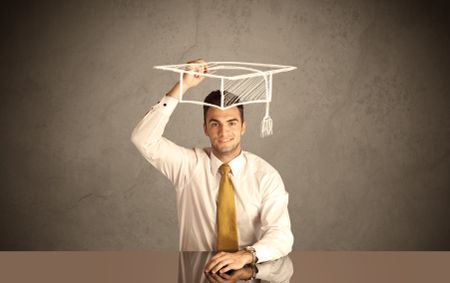 An elegant, successful university student drawing himself a square academic mortarboard cap with a chalk in front of grey wall background concept
