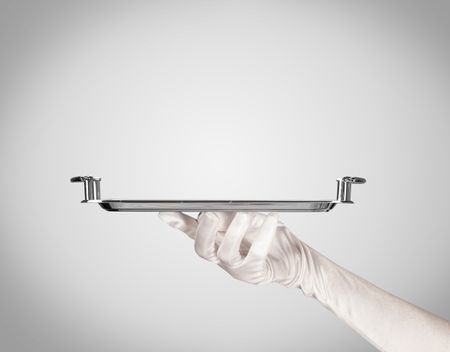 An elegant waiter business hand in white glove holding an empty plate with grey blank gradient background.