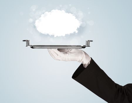 An elegant waiter business hand in white glove holding a plate with empty clear cloud in front of blue gradient background.