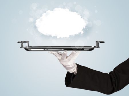 An elegant waiter business hand in white glove holding a plate with empty clear cloud in front of blue gradient background.
