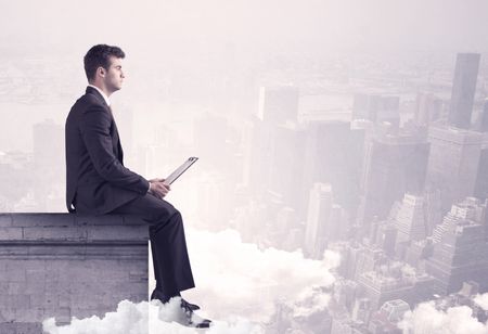 An elegant young businessman sitting on the edge looking over urban city landscape with clouds concept