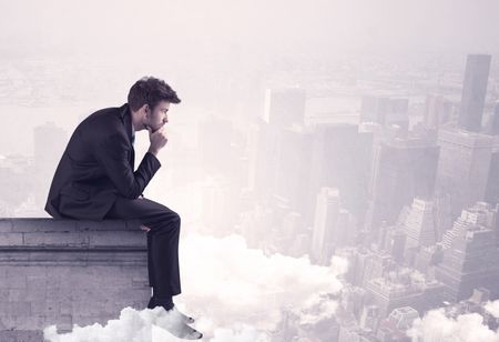 An elegant young businessman sitting on the edge looking over urban city landscape with clouds concept