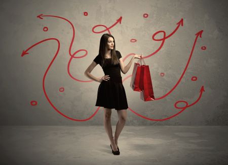 An elegant young lady in black holding red shopping bags in front of urban wall background with drawn red arrows and circles concept