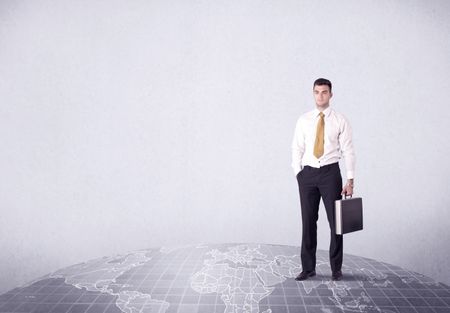 An elegant young male businessman standing on top of the world, pointing up concept with drawn earth map.