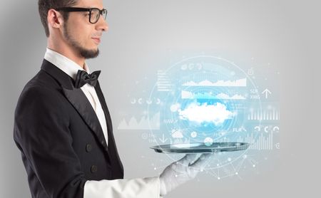 Elegant young waiter serving cloud technology concept