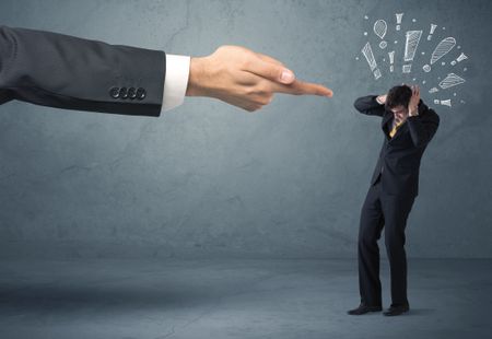 Employee in trouble getting last warning from boss concept with big business hand pointing at salesman and drawn exclamation marks