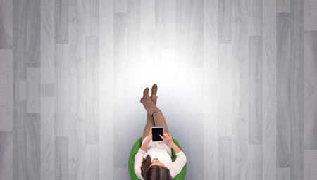 Empty office with woman in a chair and device on her hand