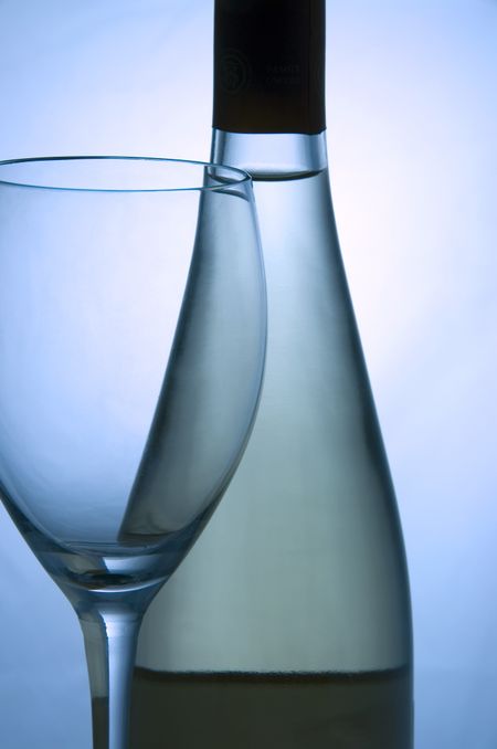 Empty wine glass by unopened bottle of white wine
