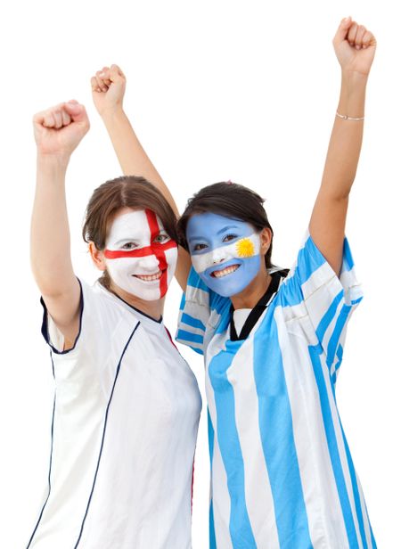 English and argentinean football fans celebrating isolated over a white background