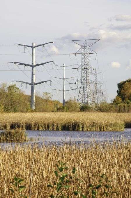 Environmental landscape in mid October, with lake and reeds in foreground and two rows of transmission towers receding across forest preserve in northern Illinois