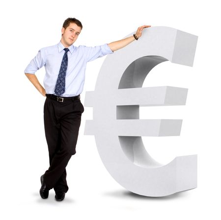 euro currency sign with a business man leaning on it - isolated over a white background