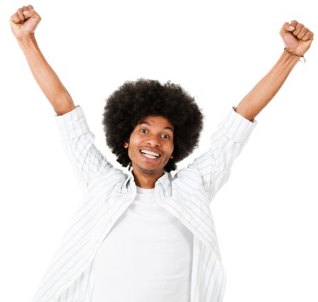 Excited black man with arms up - isolated over a white background