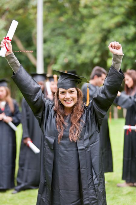 Excited grad student with her arms up
