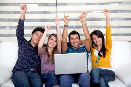 Excited group of people sitting on the sofa with a laptop