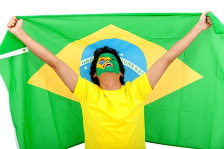 Excited man with the Brazilian flag painted on his face