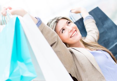 Excited shopping woman with arms up holding bags