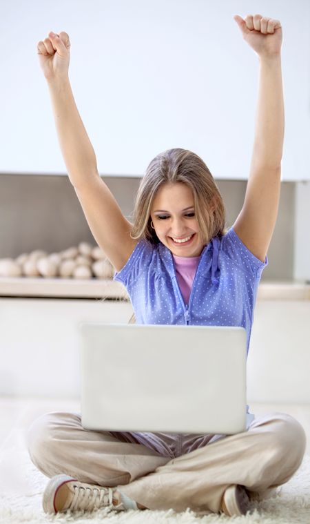 Excited woman with a computer and her arms up