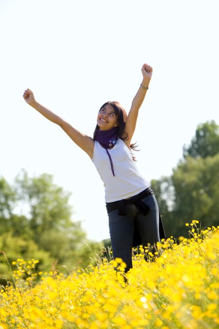 Excited woman outdoors with her arms up