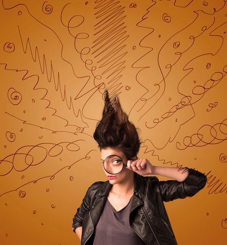 Excited young woman with extreme hairtsyle and hand drawn lines concept on background