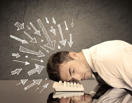 An exhausted business person resting his head on keyboard with pressure illustrated by arrows pointing at him concept