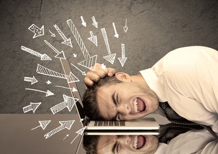 An exhausted business person resting his head on keyboard with pressure illustrated by arrows pointing at him concept