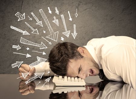 An exhausted business person resting his head on keyboard with pressure illustrated by arrows pointing at him concept